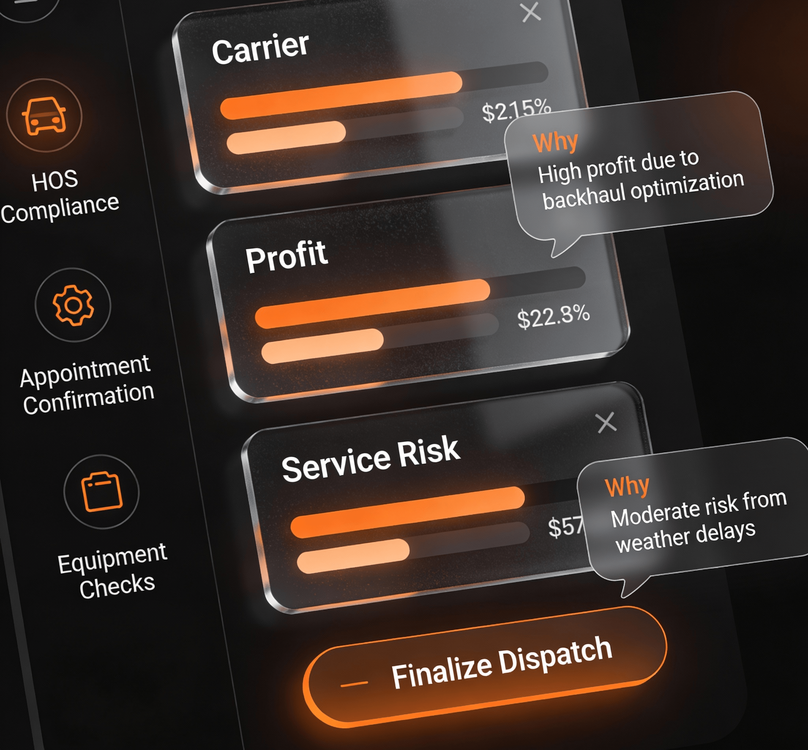 Carrier/lane recommendations scored by profit and service risk with the clear “why,” HOS/appointment/equipment checks, and human-in-the-loop control.